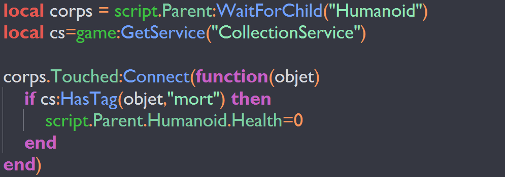 Maintenant qu’on sait quand on touche un objet on va regarder les info de cette objet et pour ça il nous faut le CollectionService. Un service de roblox qui est capable d’analysé les objets sur la scene