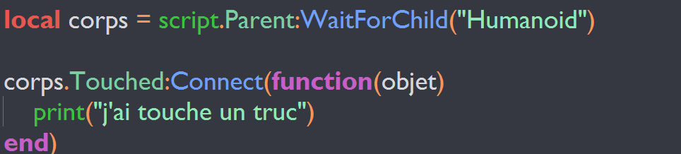 « Le code n’a pas access directement au corps, il doit d’abord aller chercher son parent le joueur qui est l’entité qui contient plusieur enfants le corps du joueur mais aussi les script et des informations sur celui ci comme le skin par exemple. On doit donc faire ce chemin pour acceder au corps du joueur (appellé humanoid dans Roblox) »