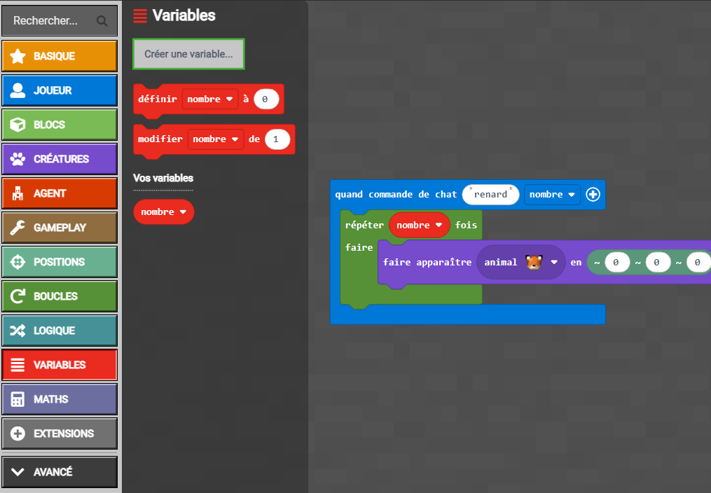(Bonus) Une fois réussi, on peut en profiter pour ajouter les variables des commande de chat qui permettent d’ajouter un chiffre dans la commande pour choisir le nombre d’animaux qu’on veut faire apparaitre