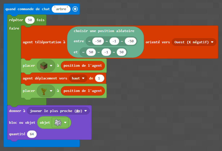 Pour faire les arbres on va demander à notre agent de se téléporter à un endroit au hasard d’y mettre un bloc de terre de monter d’un bloc et de poser une pousse d’arbre dessus. Et on répète l’opération plein de fois.