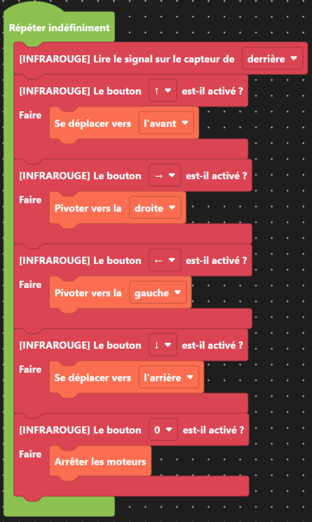 On met dans chacun de ces blocs de capteur, le bloc de mouvement qui correspond (Si on appuie sur flèche droite, on tourne a droite, etc)