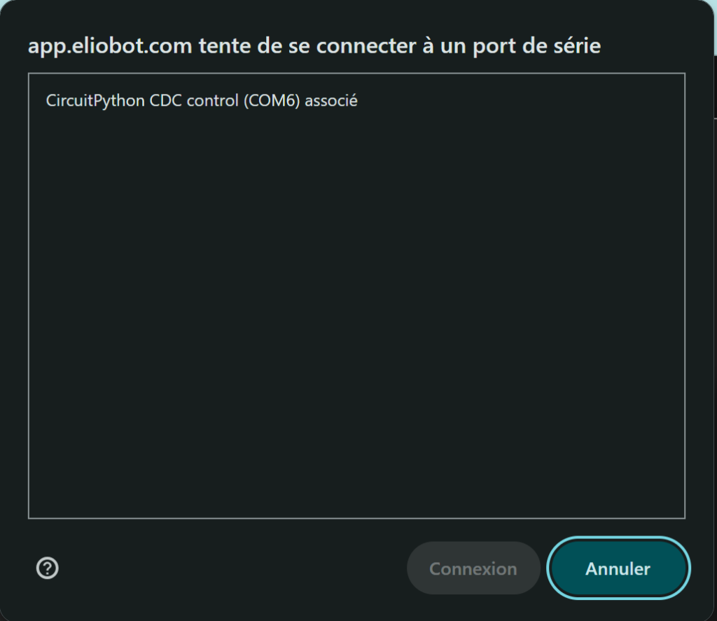 On te demande de bien selectionner l’eliobot qui est connecté à l’ordi (au cas ou tu en ais plusieurs)