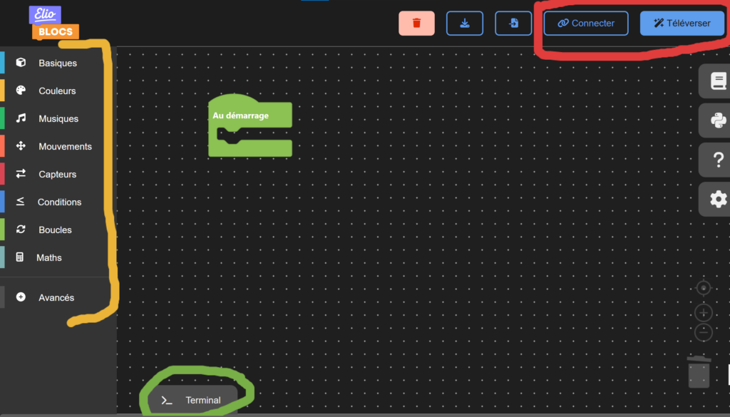 En jaune: la bibliothèque des blocs (comme dans scratch)