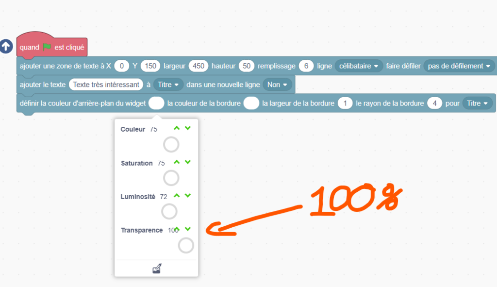 Avec le bloc « définir la couleur d’arrière-plan du widget » tu vas pouvoir personnaliser ta zone d’arrière-plan et la rendre invisible si tu le souhaites.