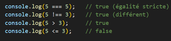 Ces opérateurs comparent deux valeurs et renvoient true ou false.