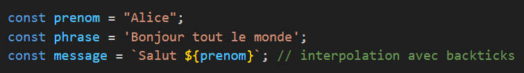 Un texte, entouré de guillemets simples ‘…’, doubles « … », ou backticks `…`.