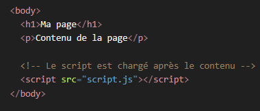 - Résultat : pas de blocage du rendu, et le JavaScript a accès à tous les éléments de la page.