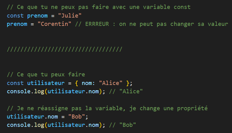- Attention : si la variable contient un objet ou un tableau, tu ne peux pas changer la variable elle-même, mais tu peux modifier le contenu de l’objet/tableau.