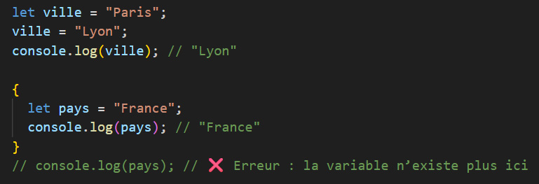 - Contrairement à var, let est plus prévisible et évite les erreurs liées au hoisting.