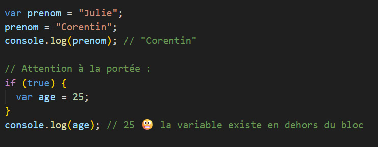 - Sa portée (scope) est particulière : une variable déclarée avec var existe dans toute la fonction où elle est déclarée, même si elle est définie dans un bloc (if, { … }).
