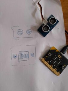 Ensuite, on va mesurer la distance avec le microbit. Si le capteur détecte quelque-chose à une distance choisie, tu vas pouvoir faire bouger le moteur, attendre un peu et remettre le moteru à la position initiale.