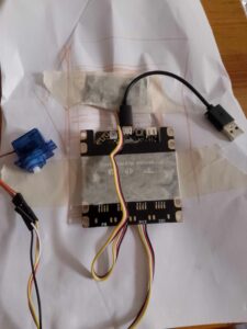 Sur le coté tu vas utiliser les pièces en plastique pour fixer un bras en carton sur le servo moteur pour qu’il puisse tourner.