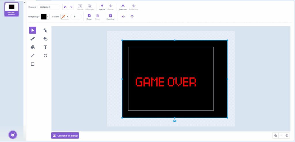 Dessine un grand fond qui recouvre toute la scène et écris au centre : “Perdu !” ou “Game Over !”