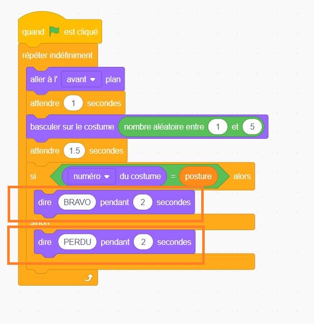 - Attend un peu que le joueur réagisse (par exemple 1.5 secondes). Si tu veux rendre le jeu plus facile, augmente le temps d’attente (par exemple “attendre 2 ou 3 secondes”).