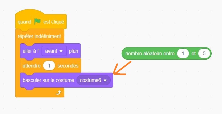 Pour cela, utilise le bloc “choisir un nombre aléatoire entre 1 et 5”.