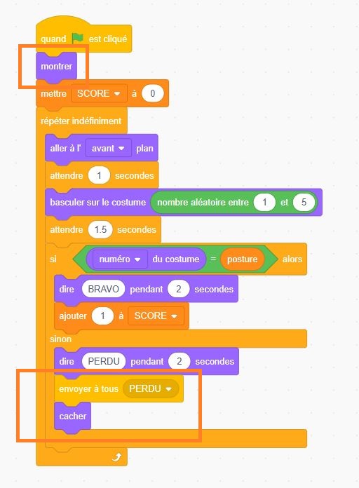 - Attend un peu que le joueur réagisse (par exemple 1.5 secondes). Si tu veux rendre le jeu plus facile, augmente le temps d’attente (par exemple “attendre 2 ou 3 secondes”).