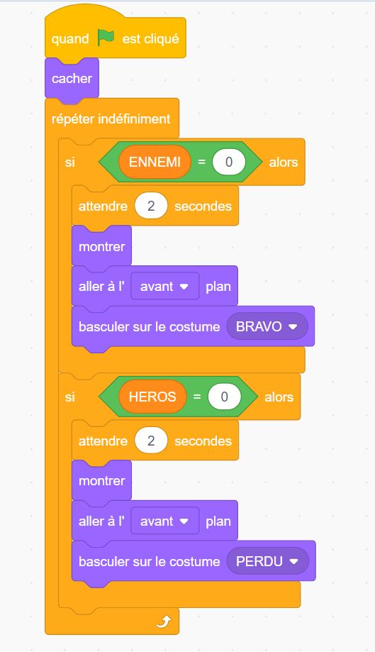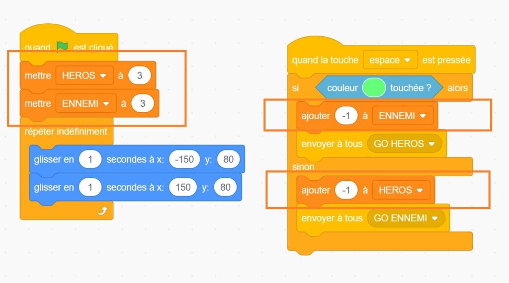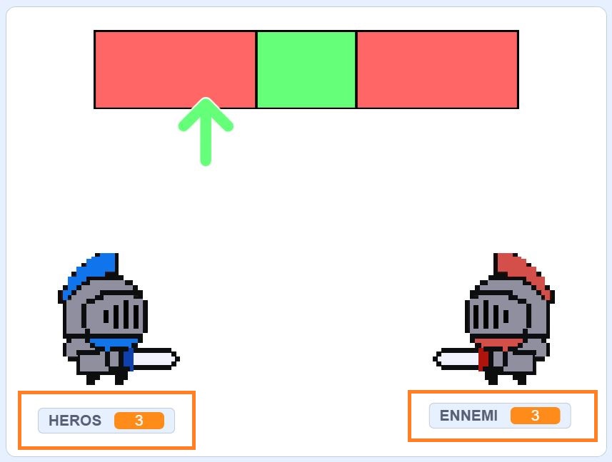 Pour que ce soit plus clair visuellement, place la variable Héros sous le chevalier de gauche et la variable Ennemi sous celui de droite.