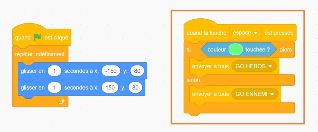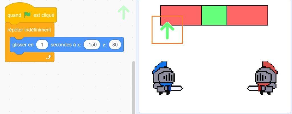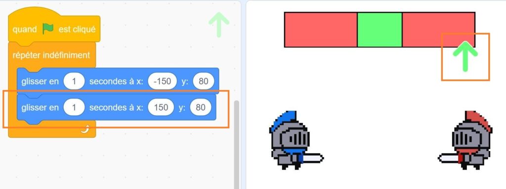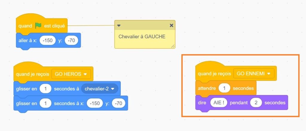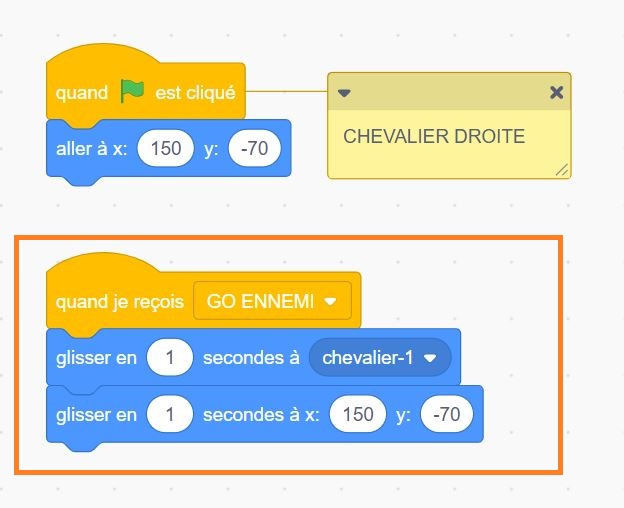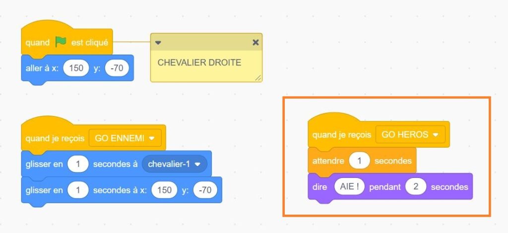 Tu peux cliquer directement sur le bloc “Quand je reçois [GO HEROS]” pour vérifier que ton chevalier bouge bien : il doit avancer vers son ennemi, puis revenir en arrière.