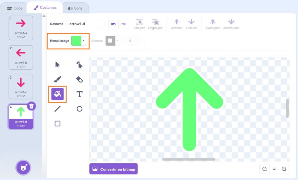 Maintenant, va chercher un sprite de flèche dans la bibliothèque (tape “arrow”).