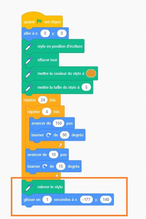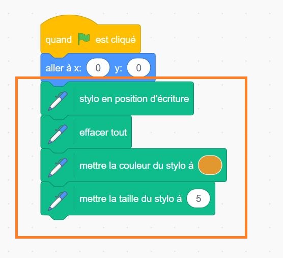 Mets le bloc “Quand le drapeau vert est cliqué”, puis ajoute : aller à x = 0 et y = 0. Ainsi ton sprite se placera au centre de la scène, au début du jeu. C’est très important, car tout ton mandala va se construire autour de ce point central.