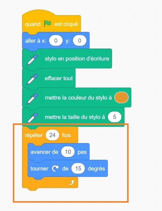 Ajoute une boucle “répéter 30 fois”, puis à l’intérieur, ajoute “avancer de 3” et “tourner de 6 degrés”.