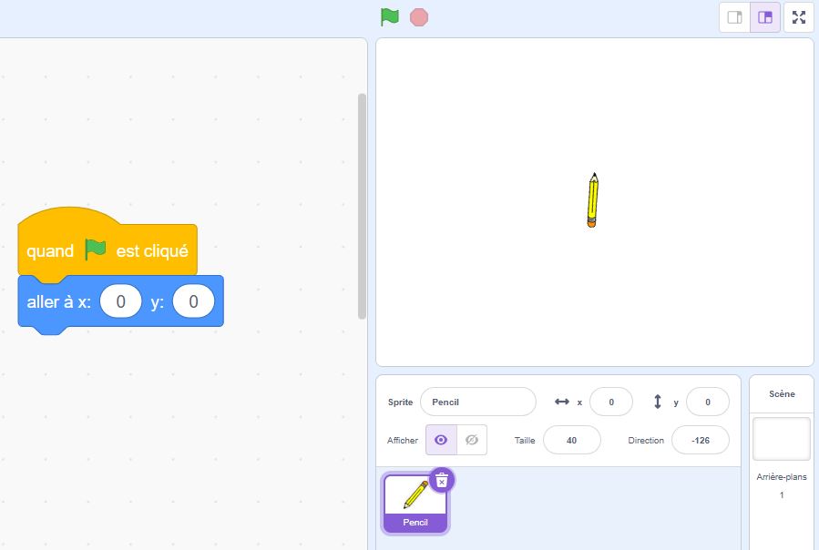 Quand tu cliques sur le drapeau vert, ton stylo est prêt, mais il ne trace encore rien : c’est normal, on n’a pas encore dit quoi dessiner.
