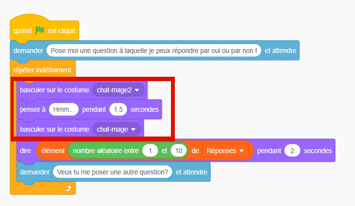 Tu peux ajouter un peu de vie à ton projet, en programmant un changement de costume et une pensée, pour faire “réfléchir” ton personnage avant de répondre.
