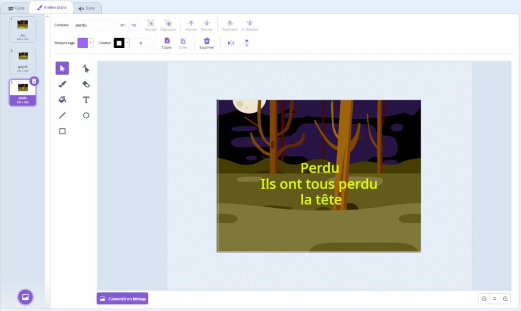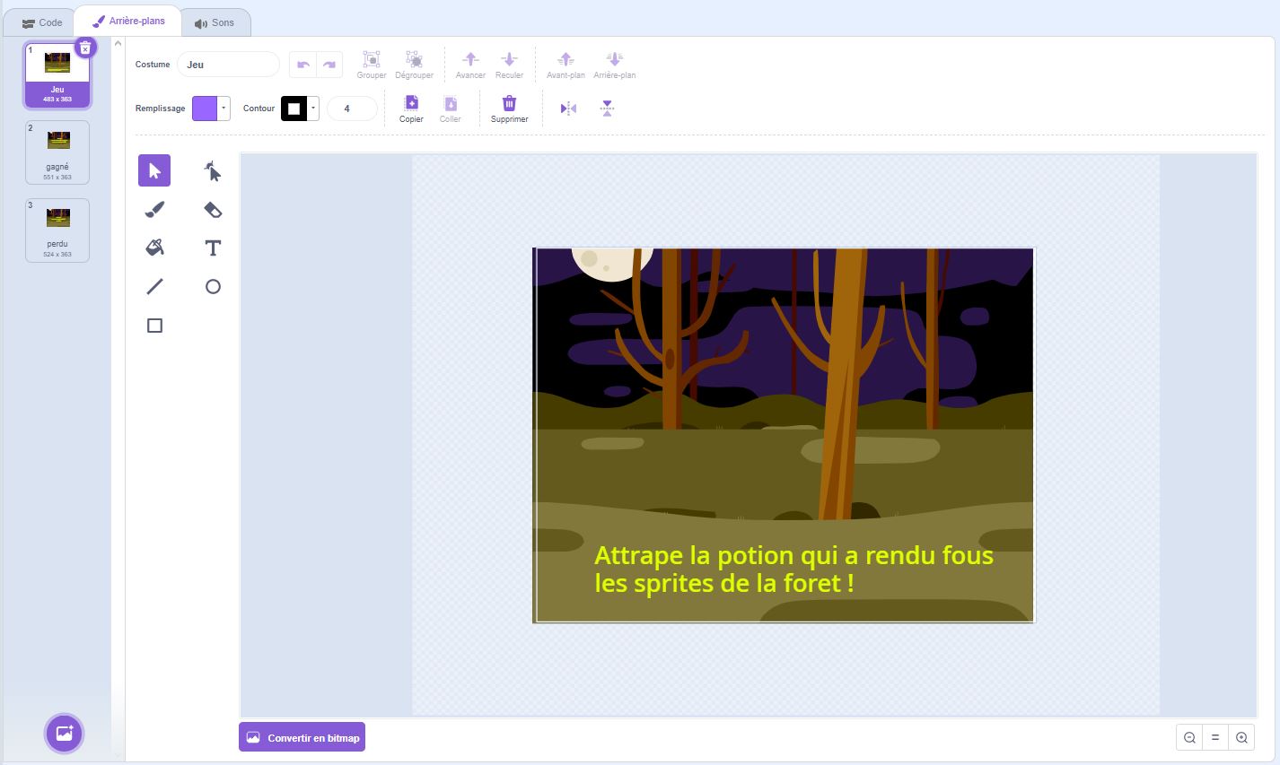Ensuite, crée un arrière-plan Gagné. Écris un message comme : “Bravo ! Tu as sauvé la forêt !” et ajoute un décor joyeux si tu veux ou conserve le même.