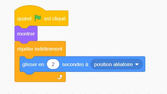 La potion devra se déplacer doucement et changer de position régulièrement. Pour cela, programme-la pour qu’elle se montre, puis qu’elle glisse en deux secondes vers une position aléatoire, et cela en boucle.