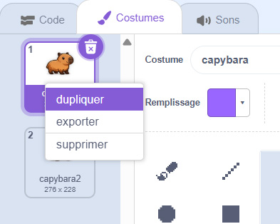 Pour cela, rends toi dans l’onglet Costumes de ton sprite. Fais un clic droit sur le costume, puis choisis Dupliquer afin d’en créer un second.