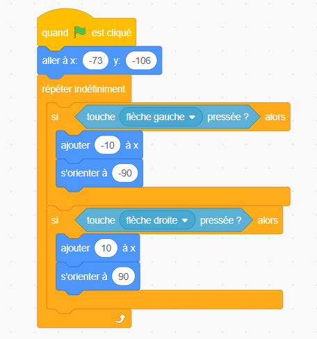 - Si tu appuies sur la flèche droite, il se déplace vers la droite et se tourne de l’autre côté.