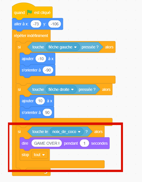 Nous allons maintenant ajouter une dernière condition à notre programme : lorsque le héros est touché par le projectile (une noix de coco dans notre exemple).