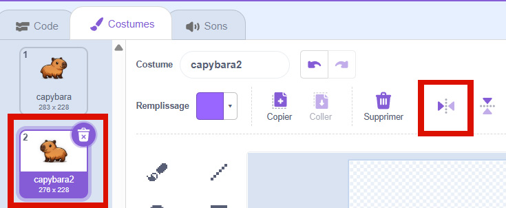 Ensuite, sélectionne le deuxième costume et clique sur l’icône « retourner horizontalement » pour obtenir ton héros dans l’autre sens.
