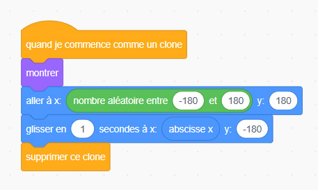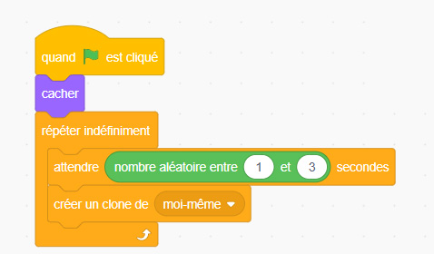 À chaque passage dans la boucle, le programme attend un temps aléatoire entre 1 et 3 secondes, puis crée un clone du sprite.
