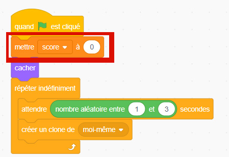 On va mettre la variable score à 0 lorsque le drapeau vert est cliqué, afin que chaque partie commence avec zéro point.