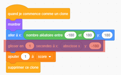 Enfin, une fois arrivé en bas de la scène, nous supprimons le clone pour éviter qu’il ne reste à l’écran et pour libérer de la place pour les suivants.