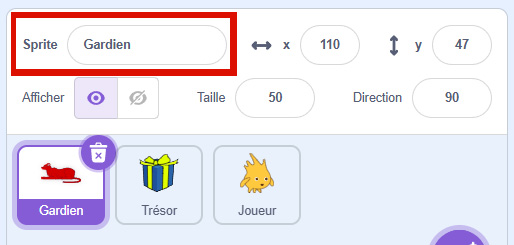 Conseil : pour le gardien, tu peux prendre un sprite de la bibliothèque Scratch, afin d’avoir des costumes assis, couché, ou debout. Cela donnera une animation lorsque le joueur va se rapprocher de lui, et quand il va le poursuivre.