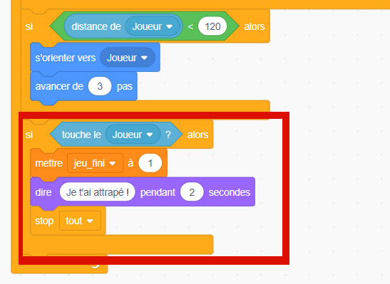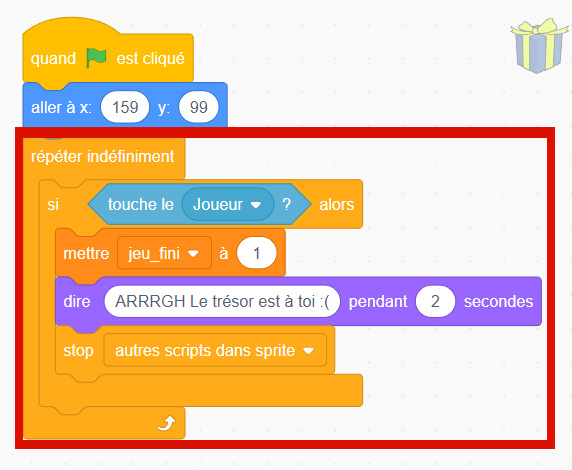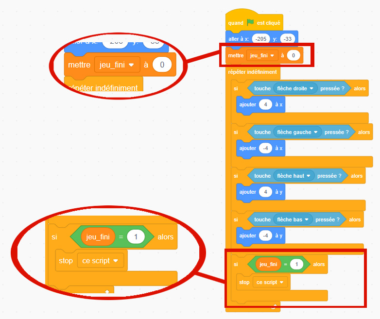 Quand on clique sur le drapeau vert, on initialise la variable jeu_fini à 0. Cela signifie que la partie commence. Ensuite, lorsque la variable jeu_fini passe à 1, cela veut dire que la partie est terminée. Dans ce cas, on arrête le script.