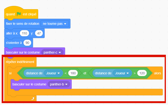 Ensuite, ajoute une boucle répéter indéfiniment. Elle permet à ton programme d’écouter en permanence les touches du clavier pendant tout le jeu.