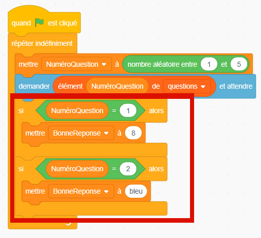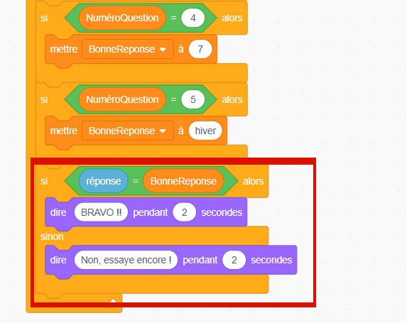 On va maintenant programmer les réponses des questions. Pour cela on va utiliser des conditions pour dire :