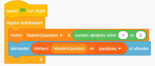Le programme tourne en boucle et choisit au hasard une question dans la liste. Il l’affiche à l’utilisateur et attend sa réponse (on continue le programme après !)