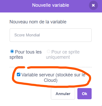 Une variable cloud est une variable dont la valeur est stockée sur les serveurs de Scratch plutôt que localement dans le projet. Elle permet de faire des choses comme un classement mondial ou partager des données entre joueur.